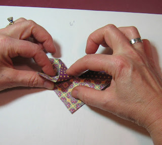 For the ribbon - I first punched a slit on the left side of the ovals then cut a piece of ribbon 19" long. I put the ribbon behind the DP on the left - came up on the right side and brought it through the slit - then I attached the paper to the card and the oval to the paper checking my placement so that the oval extended over the cut off front but not past the back edge. And finally I tied the bow. I attached 4 clear dew drops - 2 on the top left and 2 on the bottom right.